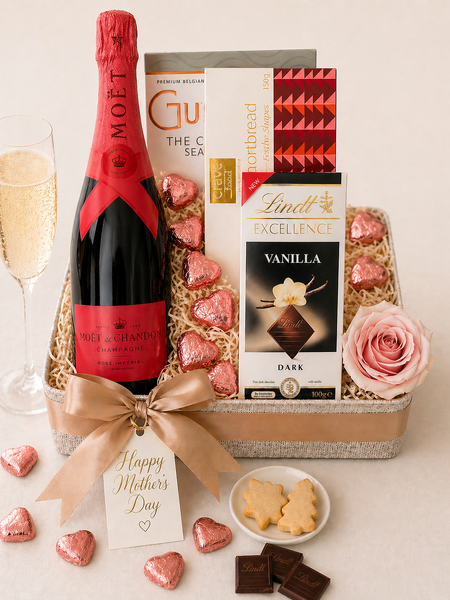 Featuring Moet Rose and a selection of decadent sweet treats, this elegant hamper is perfect for celebrating Mum in style this Mother's Day.